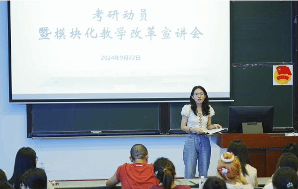会上,张易简要介绍了模块化教学班的总体思路、服务定位、开班时间及淘汰机制。她指出,模块化教学模式旨在为不同目标的同学提供针对性的服务,帮助每一位同学明确未来发展道路,希望大家把握机会,认真学习。同时,张易对2022级员工进行了考研动员,希望同学们认清形势,提前做好准备,合理规划自己的考研之路。