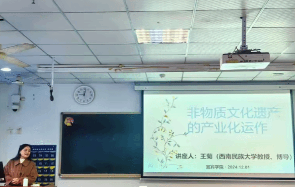 12月1日,西南民族大学教授、博导王菊开展了《非物质文化遗产的产业化运作》的专题讲座。王菊教授以宜宾非遗文化为切入点,系统介绍了知识产权制度保护、著作权保护、商标保护、商业秘密保护以及目前非遗保护存在的问题。她强调,文化就是人化,传承的精髓在于“传、承、守”三字,并结合自身经历,鼓励同学们提高思想觉悟,积极投身于非遗保护中去,让非遗走进课堂、社区、市场、产业。此外,王菊教授还以彝族漆器、川剧、李子染为案例,进一步阐释了“人”、“技”、“和”三个字的概念,加深了同学们对非遗产业化的认识。