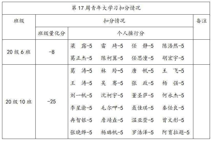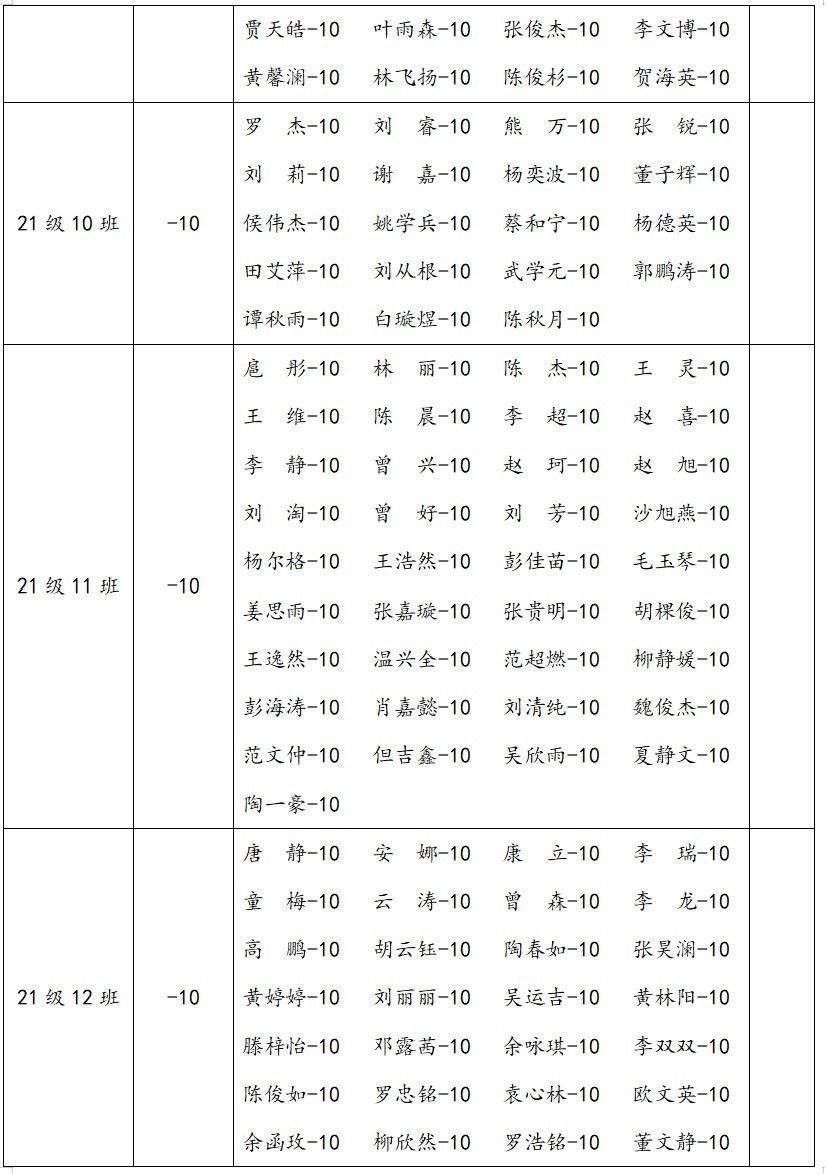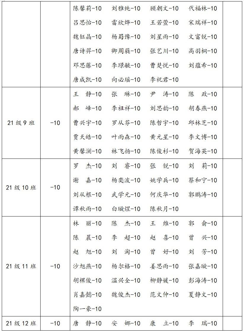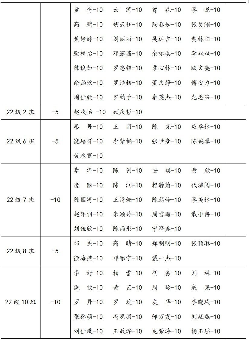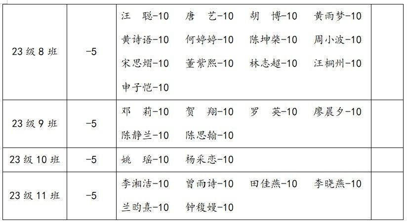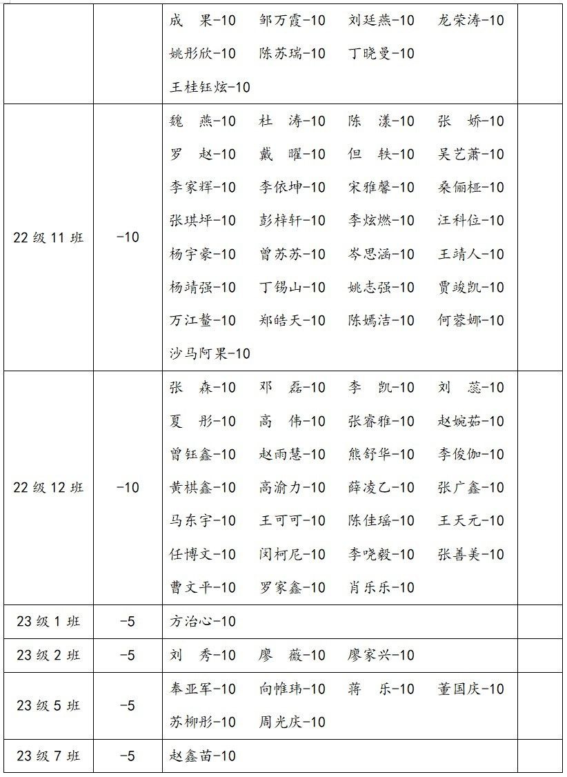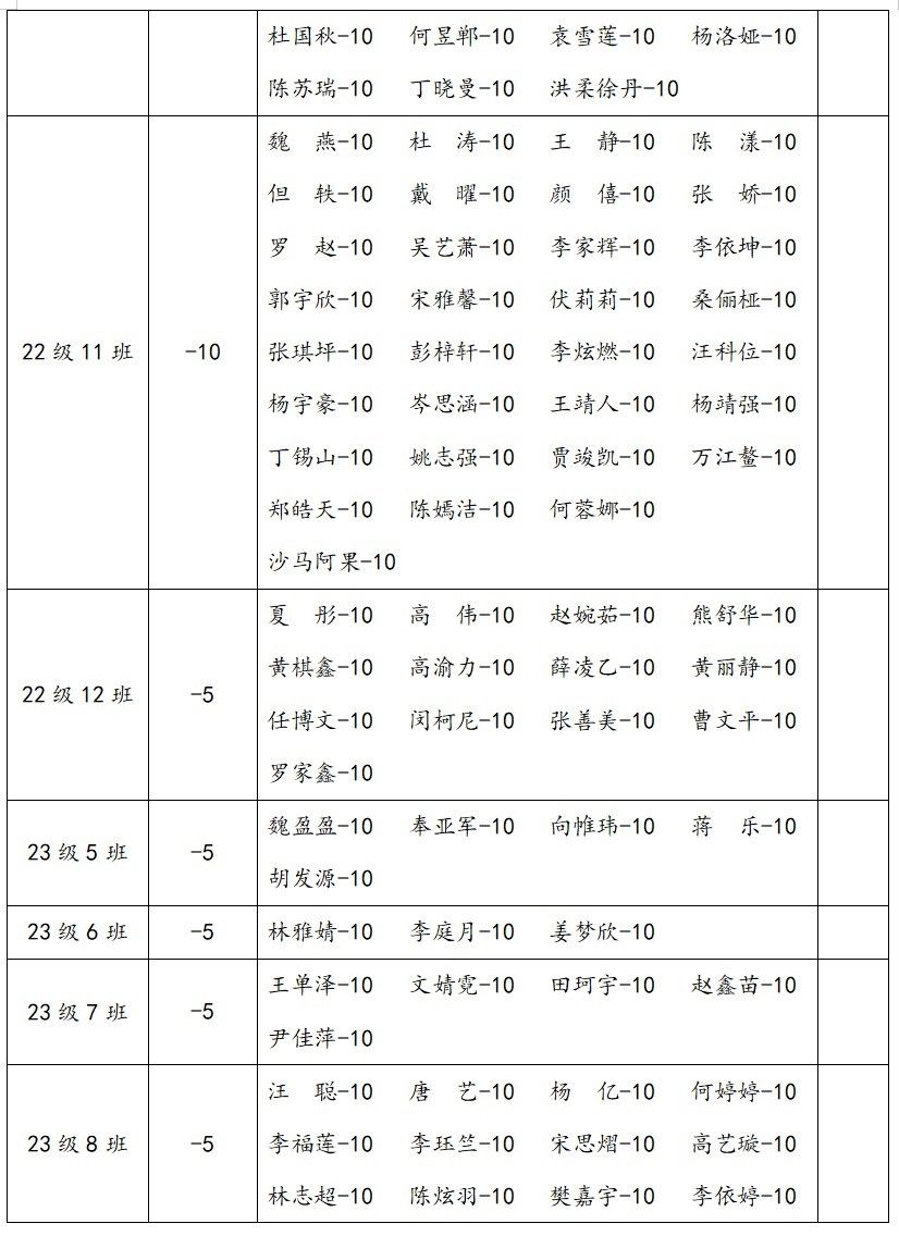 2.在2023-2024学年上学期第四堂团课中,以下同学严重违反团组织生活纪律,情节恶劣;据细则,进行全院通报批评一次,扣除个人操行分10分,并扣除班级量化分5分。