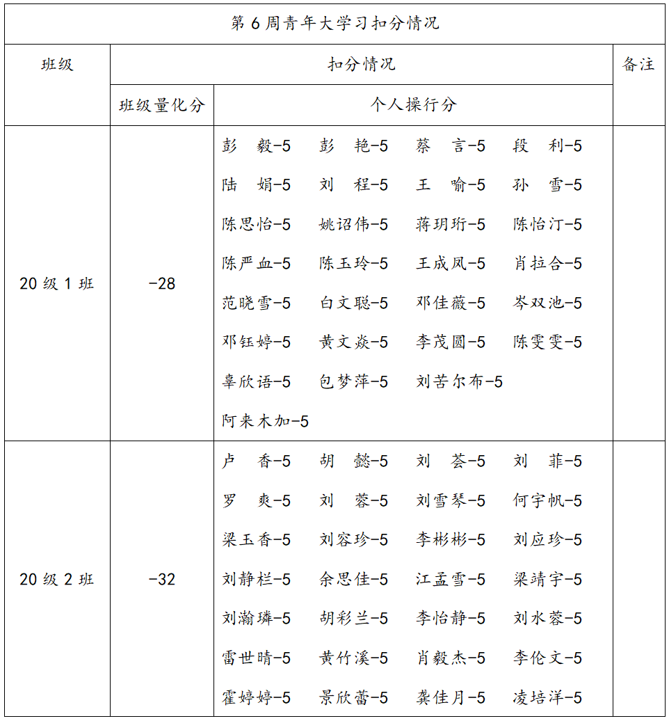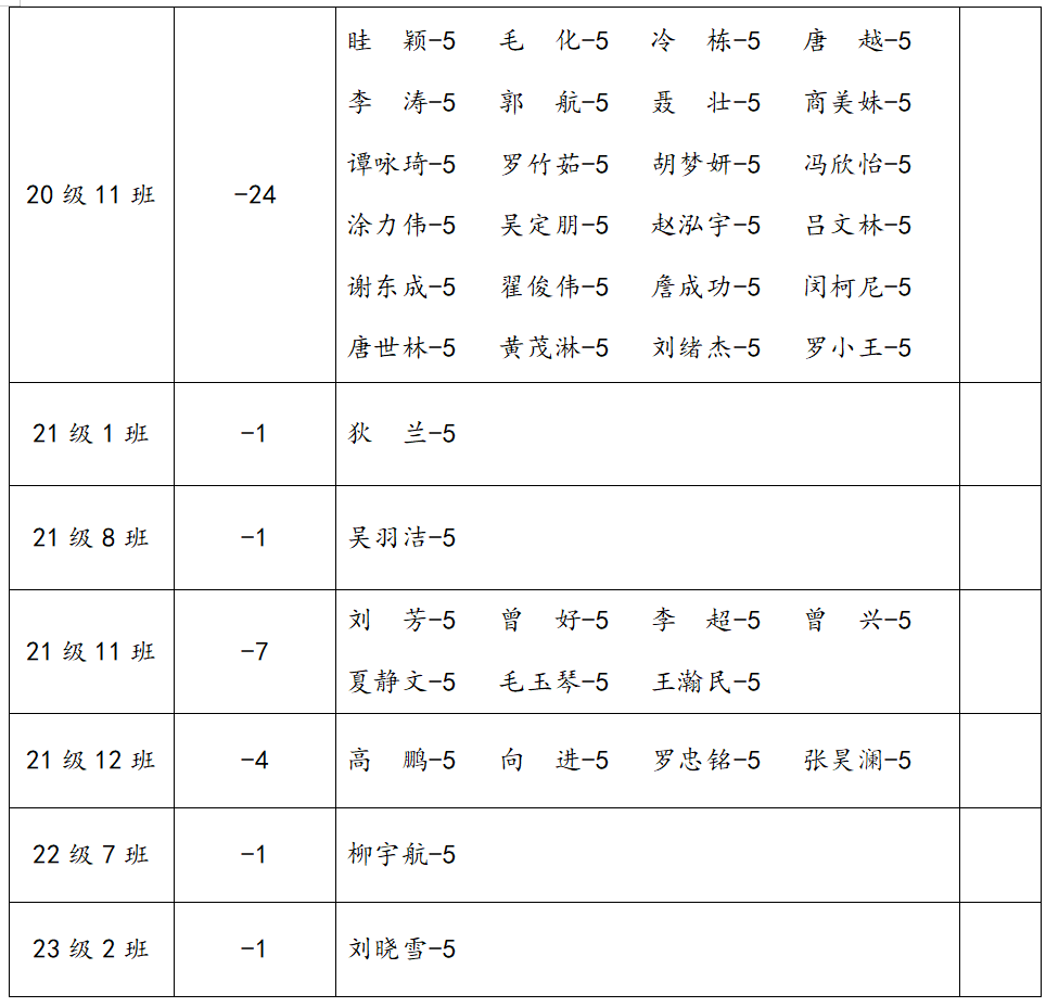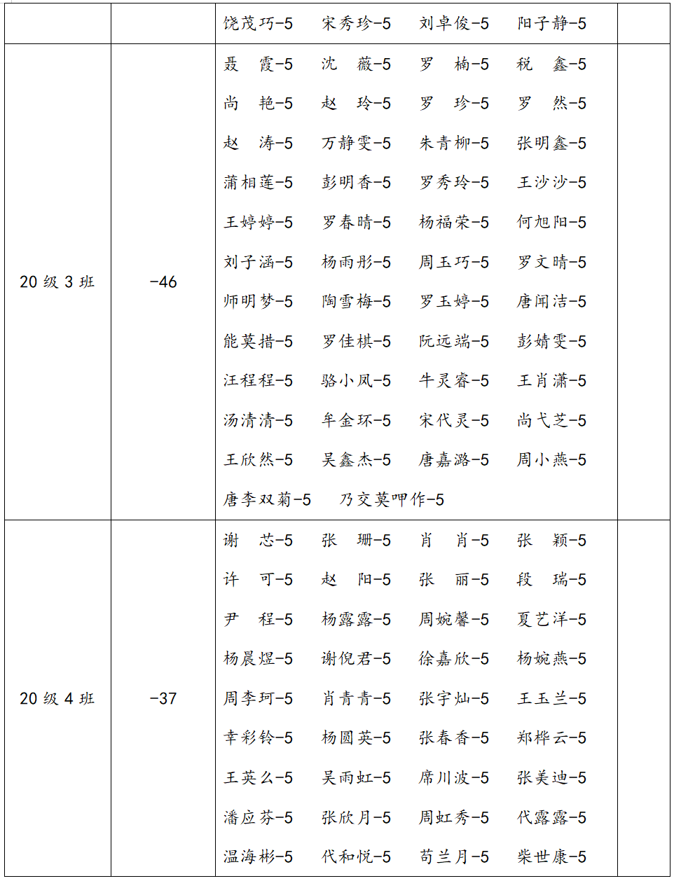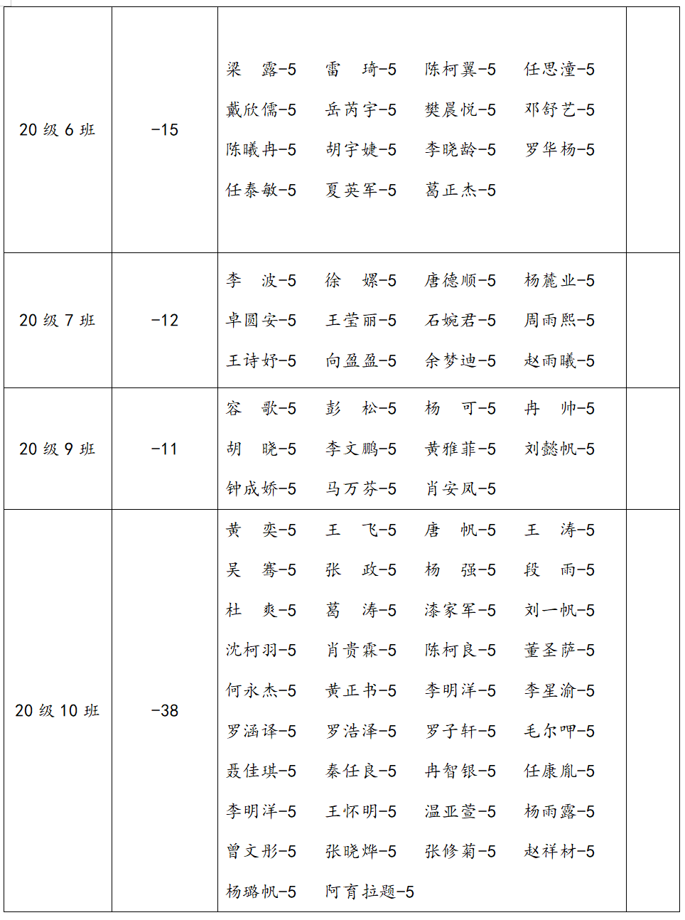 3.在2023-2024学年下学期第二堂团课中,以下班级团支书开会不假不到,特此批评;据细则,进行全院通报批评一次,扣除个人操行分10分,并扣除班级量化分5分。