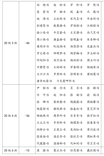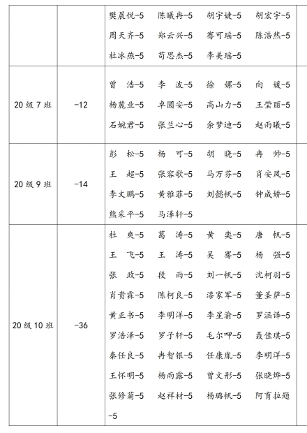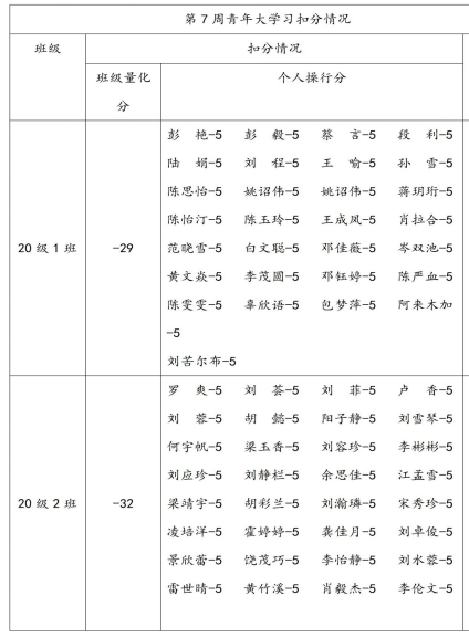 1.在2023-2024学年下学期第七周青年大学习中,以下班级出现未学习的情况,情节恶劣;据细则,每人每次扣除个人操行分5分,并扣除所属班级量化分1分。