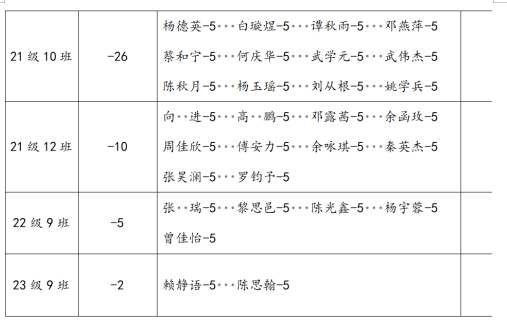 1. 在2023-2024学年下学期第八周青年大学习中,以下班级出现未学习的情况,情节恶劣;据细则,每人每次扣除个人操行分5分,并扣除所属班级量化分1分。具体名单如下: