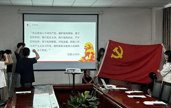 大会伊始,全体同志起立奏唱《国际歌》。党总支副书记张易致辞并宣读新发展党员名单。她要求新发展党员要认真学习党的方针政策,坚定共产主义信念,以实际行动践行全心全意为人民服务的宗旨。音表支部书记吴琴领誓,全体新发展党员面向党旗站立,举起右手握拳,庄严宣誓。